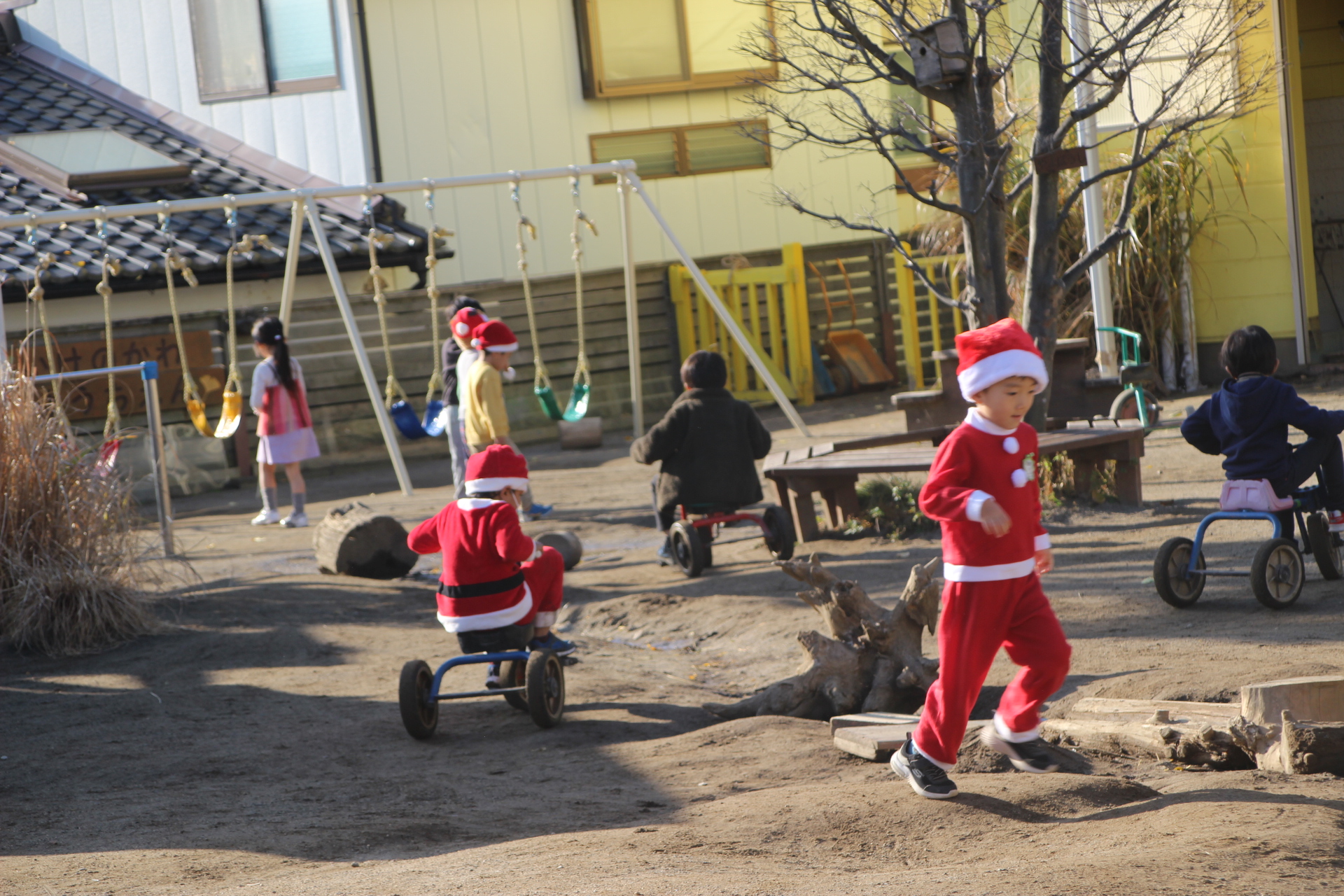 きょうも青空 いい天気。待ちに待ったクリスマス会。なんだか幼稚園の庭にも小さなサンタさんがたくさんいましたよ。あらあらトナカイさんも。追いかけっこをしたり三輪車でいそいそ走りまわったりの大忙し。「サンタクロース来るかな!来るといいな・・・」の思いは、あちらこちらで募ります。