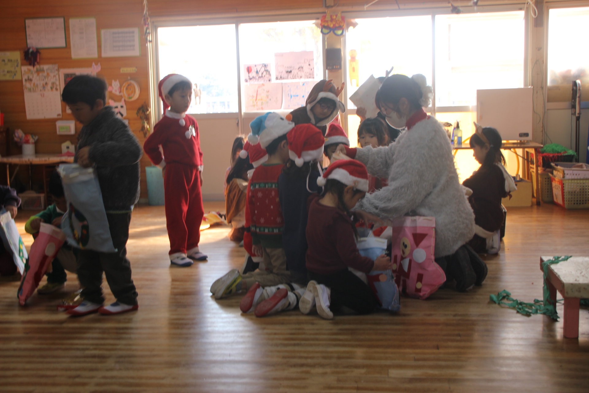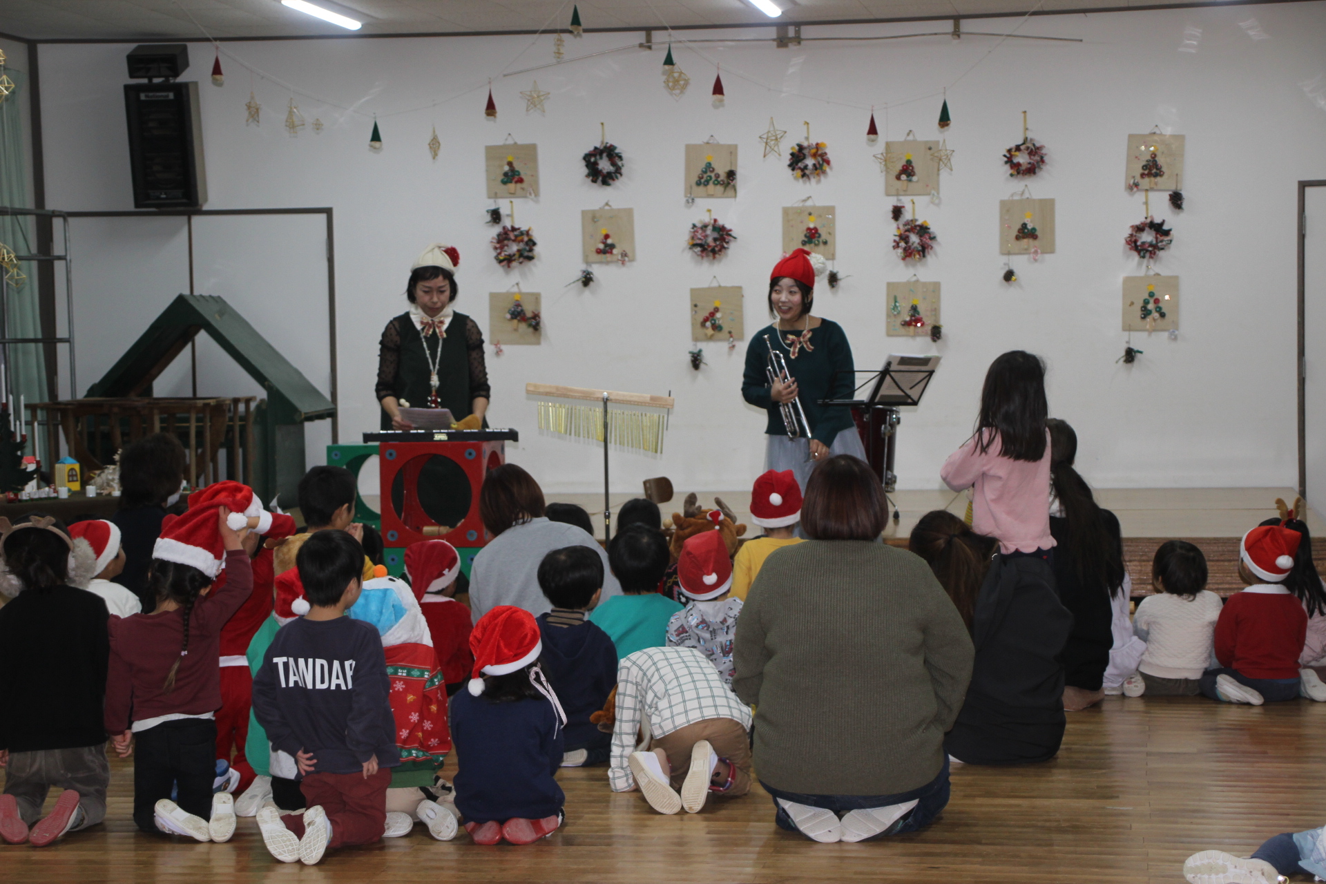1部は、お楽しみ会。みんなで踊る「サンタは今頃」のダンスから幕開けです。その次は、なんと年長さんが、ジングルベルの合奏を演奏してくれました。さすがの年長さん。すっかりクリスマス気分が盛り上がったところで、お客様。卒園児のお母さん3人によるアンサンブルコンサートです。「あっ、運動会にも演奏してくれた人だ!」子どもたち、よく覚えていました。「そりすべり」と「サンタは今頃」と「ジングルベル」を、ピアノとトランペットと鉄筋の奏でるメロディーに様々な打楽器を取り入れて素敵に演奏してくださいました。ノリノリで体を動かしたり、トランペットを吹く真似をしながら聞いていたりと、身体中で楽しんでいました。