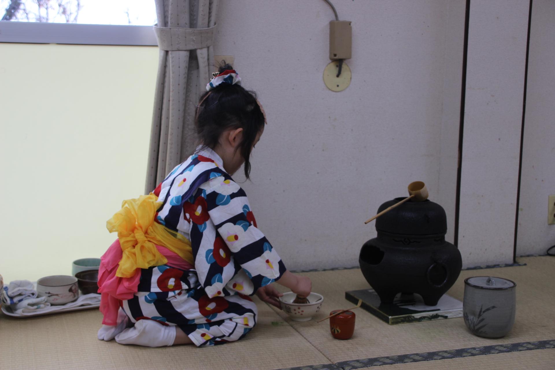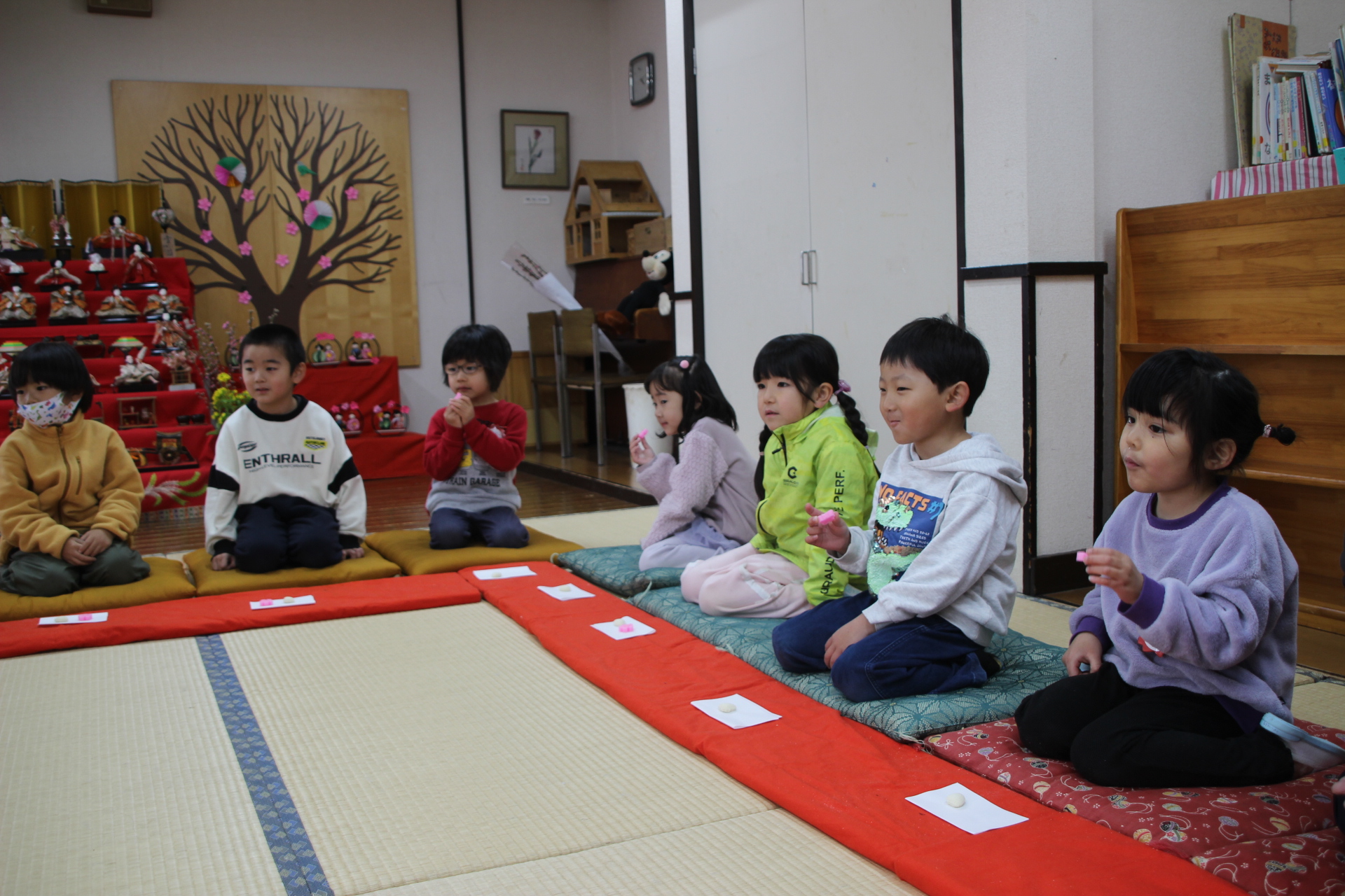 年少さんも神妙な面持ちで、お雛様のように正座して、お干菓子を頂きお茶を飲みました。お干菓子を殆どの子が食べたのには驚きでした。Y先生が、お茶の道具のあれこれの名前や用途を教えて下さったのをよく聞いていて、七段飾りの中にもお茶道具があることを教えてもらい、「どこにあるかな」と探しましたよ。。