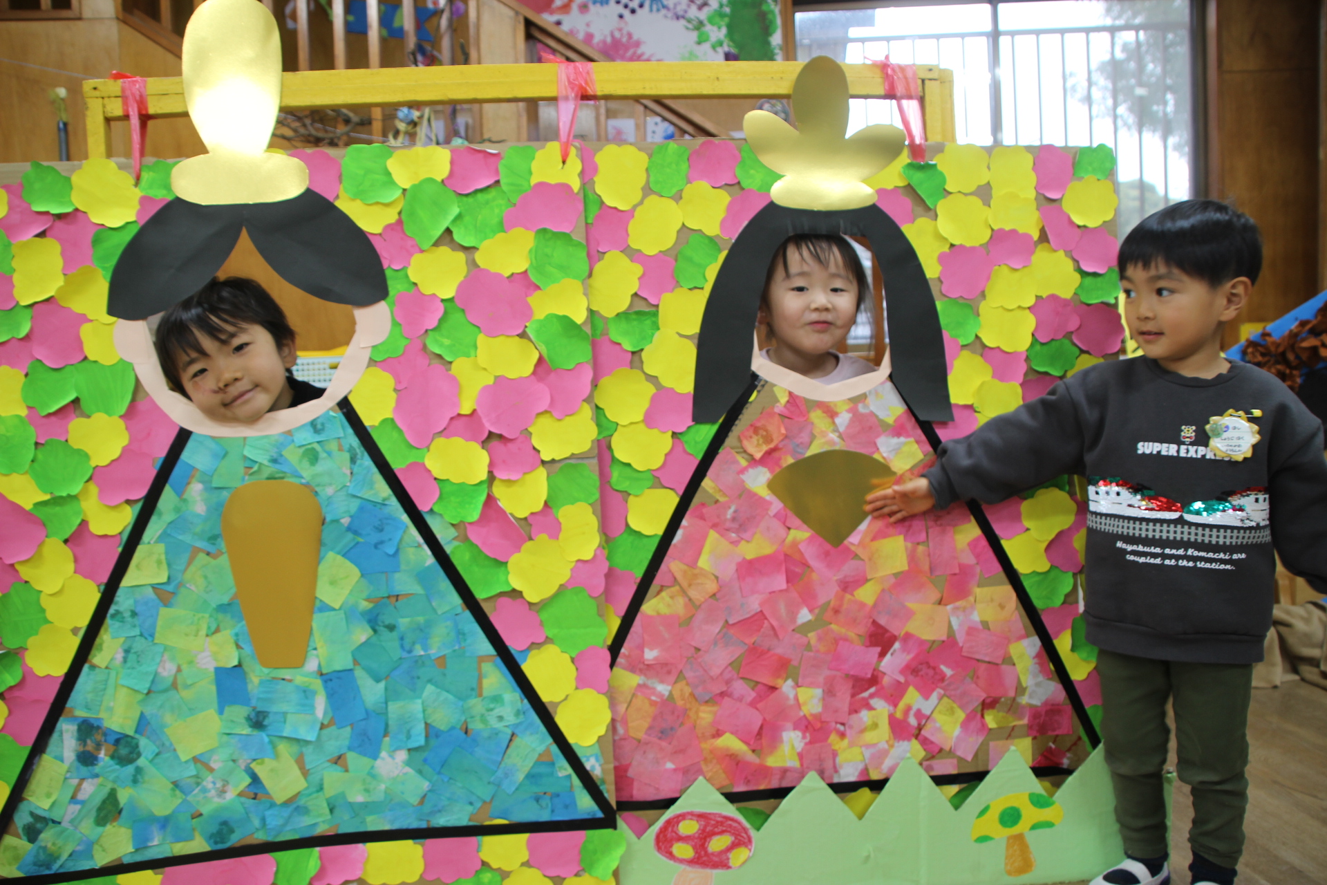 年少さんみんなで力を合わせ、紙を破って糊で貼って作った大きなお雛様です。私も入らせていただきお雛様気分を味わいました。