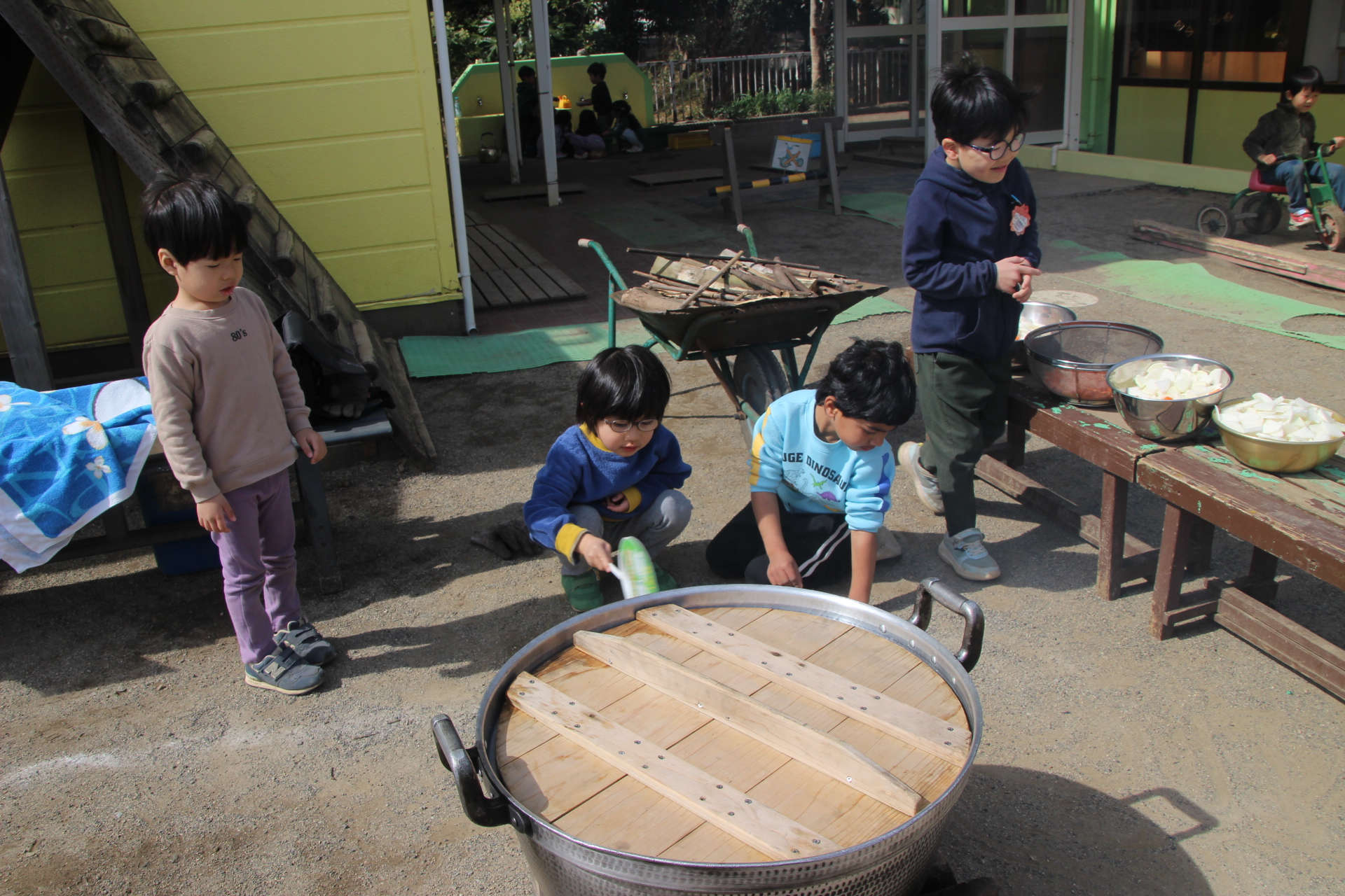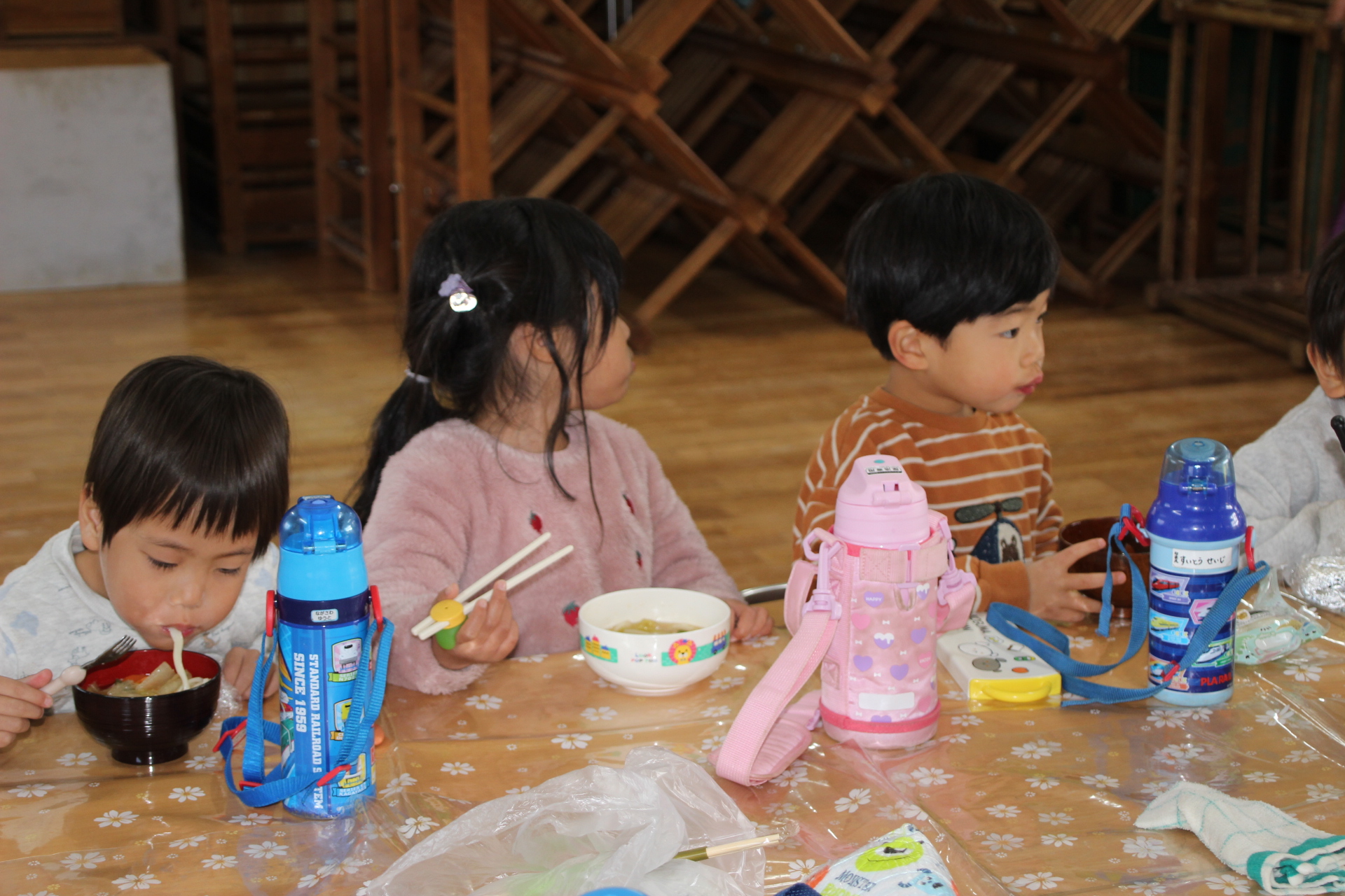 きょうの昼食は、み~んなで遊戯室で食べました。なんとメニューは、年中さん手作りのうどんです。うどんは、昨日のうちに粉を混ぜて伸ばして切って作りました。きょうは、うどんの汁に入れる、大根と人参のいちょう切りに挑みました。園で包丁を使うのは、2回目。1回目は11月のお芋パーティの時にふかし芋を切りました。今回は、ふかし芋より硬い大根と人参です。私は火の番をしながら、大根と人参が来るのを待っていました。結構な早業で私の手元に届いた大根と人参。湧き上がったお湯の中に他の野菜と共に入れてうどん汁の出来上がり。うどんも茹でてうどん屋さんの開店!