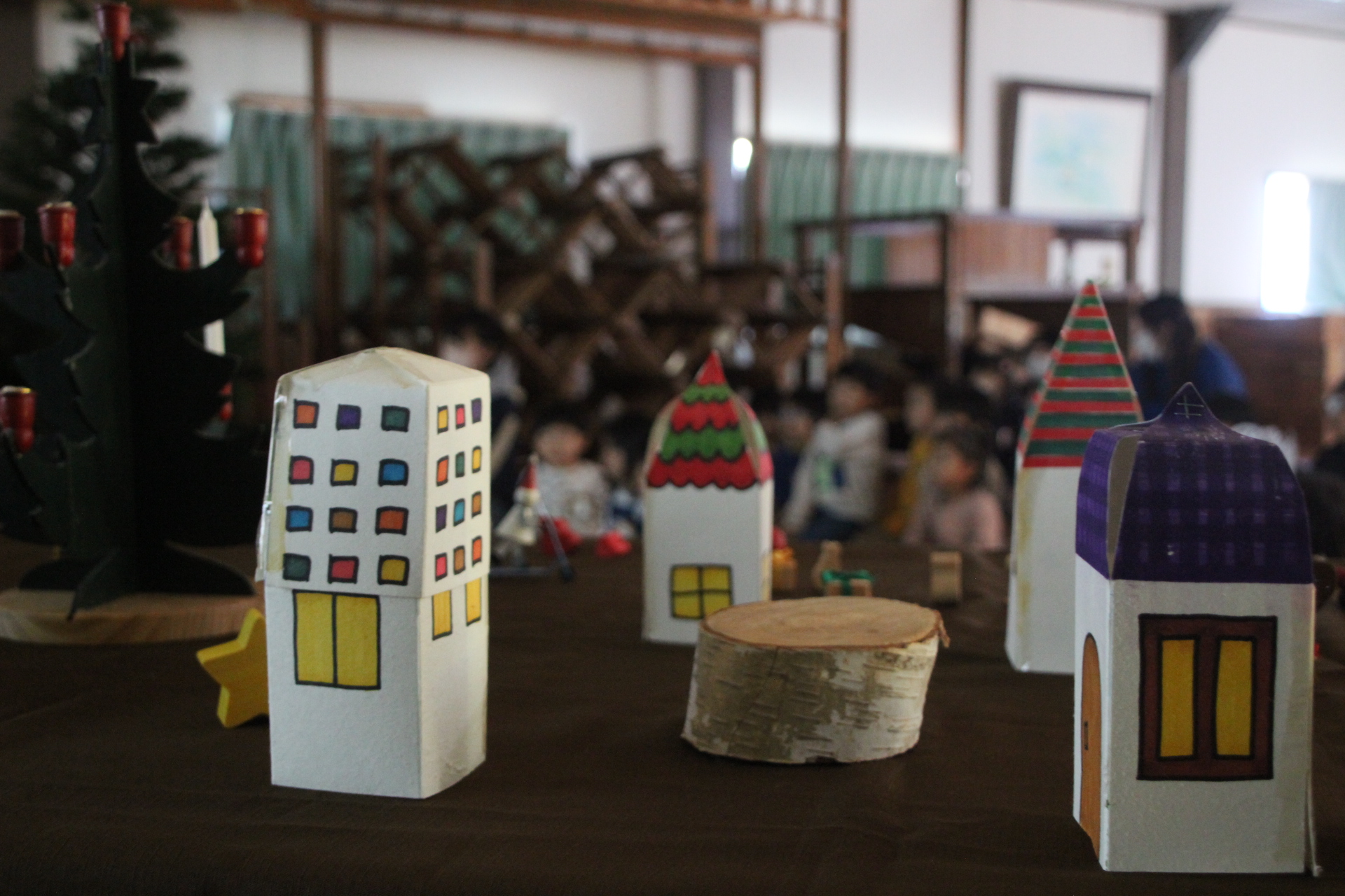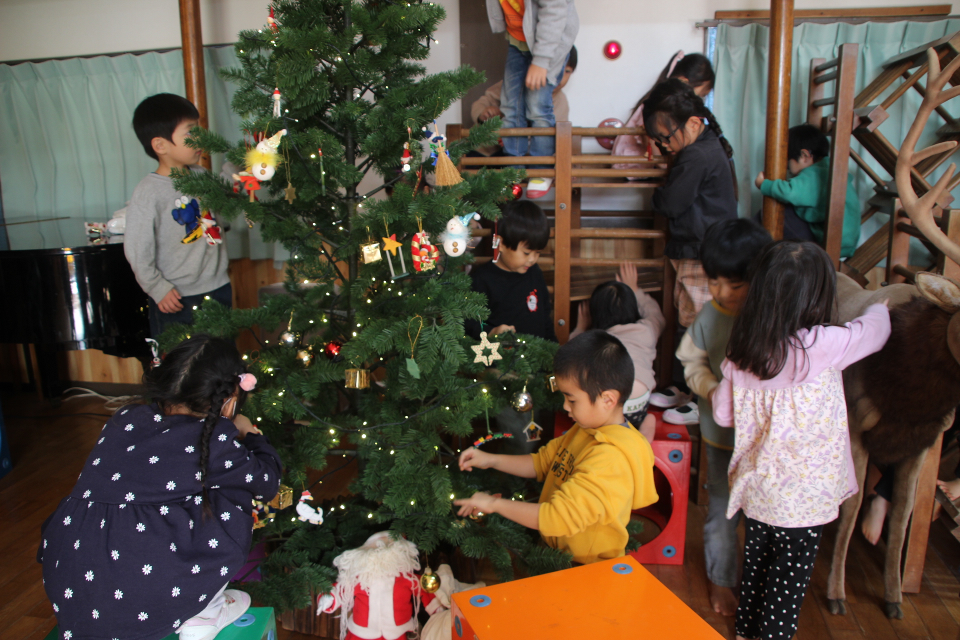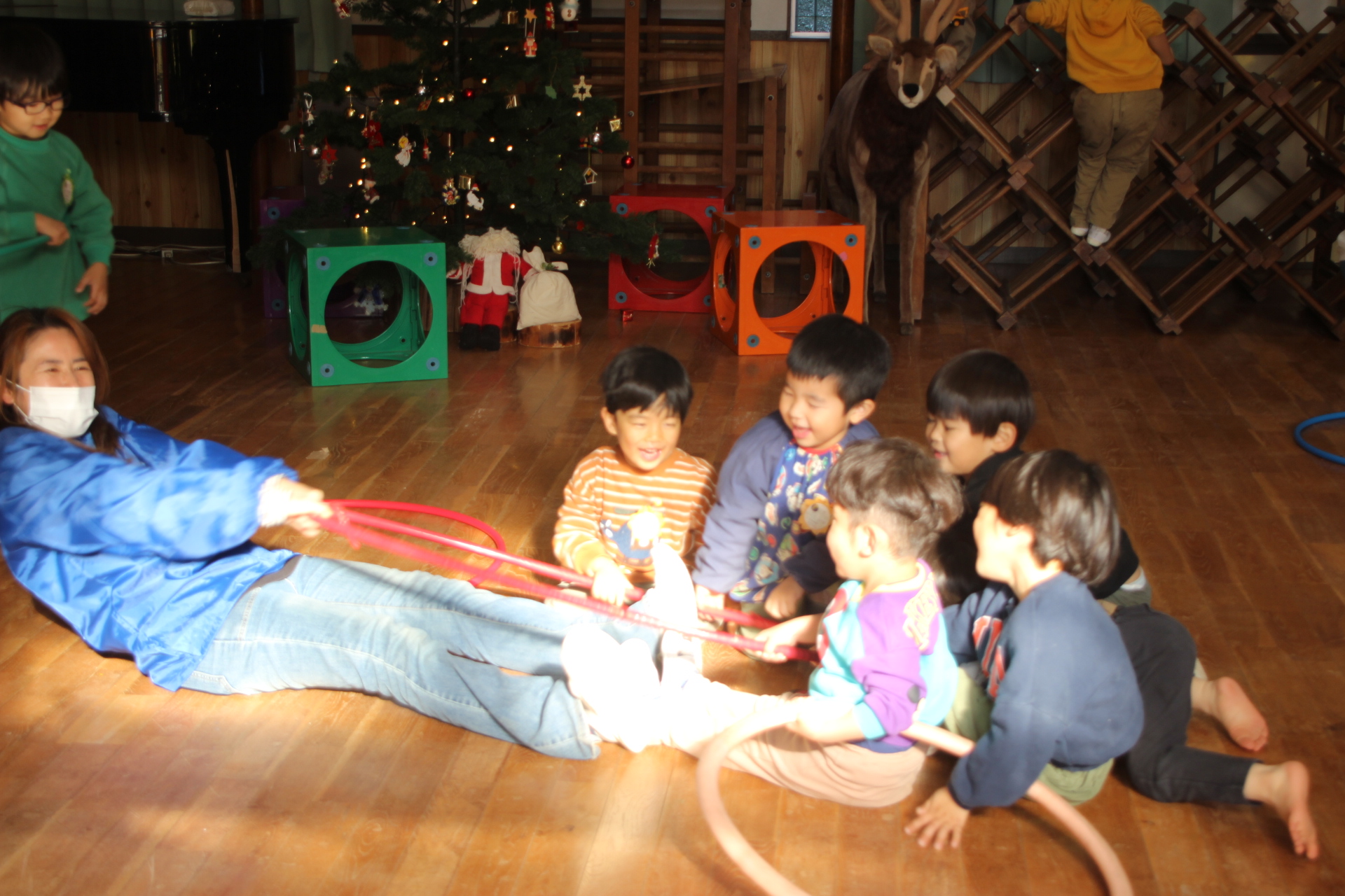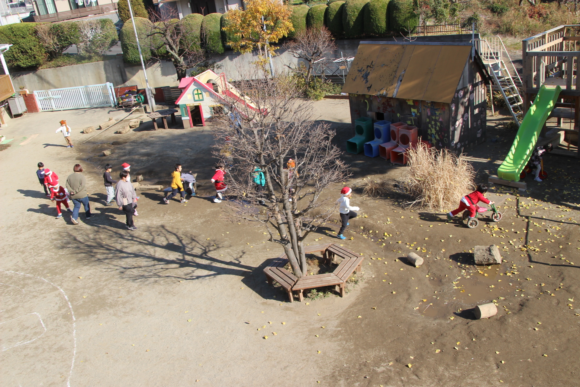 きょうも青空 いい天気。待ちに待ったクリスマス会。なんだか幼稚園の庭にも小さなサンタさんがたくさんいましたよ。あらあらトナカイさんも。追いかけっこをしたり三輪車でいそいそ走りまわったりの大忙し。「サンタクロース来るかな!来るといいな・・・」の思いは、あちらこちらで募ります。