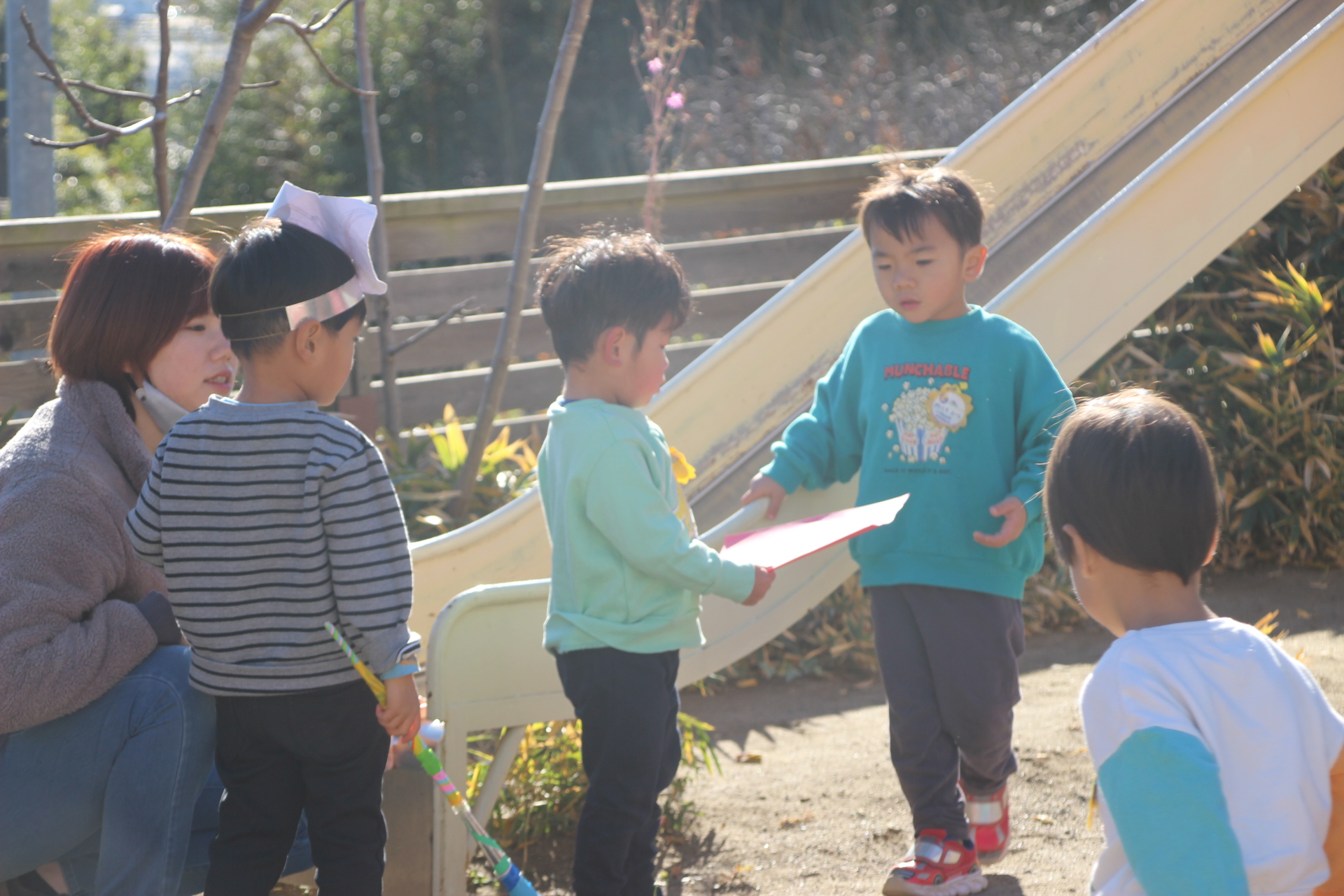 「ジングルベル」は、なんと!年長さんとの合同演奏。みんなで演奏するとなお楽し!ということで、最後は年少さんも年中さんも、好きな楽器を自分で選んで、全員で音を奏でました。とっても楽しくて、私は側にあったバケツをたたきましたよ。