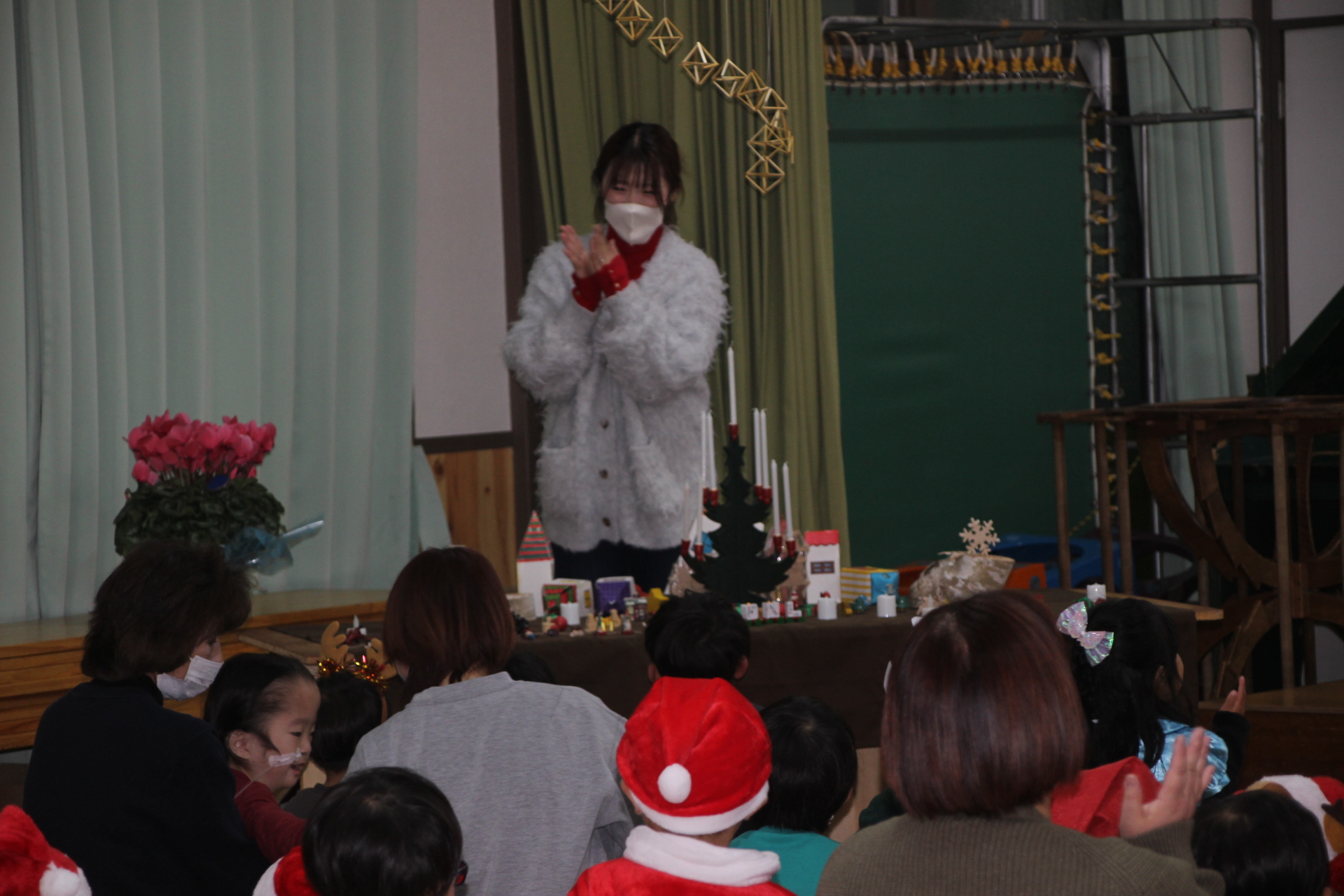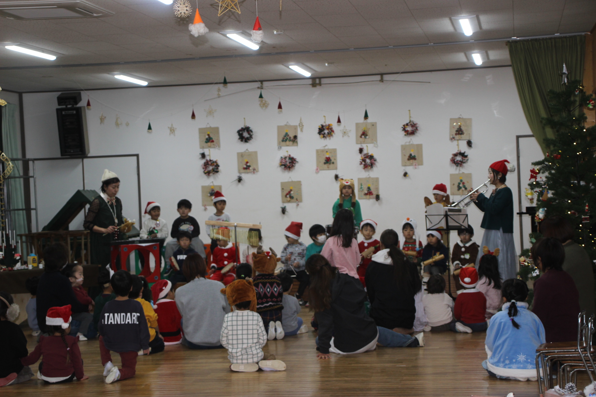 1部は、お楽しみ会。みんなで踊る「サンタは今頃」のダンスから幕開けです。その次は、なんと年長さんが、ジングルベルの合奏を演奏してくれました。さすがの年長さん。すっかりクリスマス気分が盛り上がったところで、お客様。卒園児のお母さん3人によるアンサンブルコンサートです。「あっ、運動会にも演奏してくれた人だ!」子どもたち、よく覚えていました。「そりすべり」と「サンタは今頃」と「ジングルベル」を、ピアノとトランペットと鉄筋の奏でるメロディーに様々な打楽器を取り入れて素敵に演奏してくださいました。ノリノリで体を動かしたり、トランペットを吹く真似をしながら聞いていたりと、身体中で楽しんでいました。